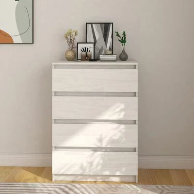 La commode est fabriquée à partir de bois de pin massif, ce qui la rend stable et durable. Avec 4 tiroirs, l’armoire de rangement offre un grand espace de rangement pour les livres, les vêtements et d’autres articles. Le dessus robuste est également idéal pour afficher des objets décoratifs, des cadres photo ou des plantes en pot.