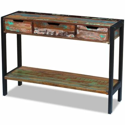 Ce buffet en bois au style vintage, fait en bois de récupération massif, sera un supplément indémodable à votre maison. Grâce à sa structure en acier robuste, ce buffet est très stable et durable. Le dessus offre une surface très stable sur laquelle vous pouvez poser des verres, un panier de fruits, un vase ou d’autres objets décoratifs. Il est doté de trois tiroirs qui vous offrent assez d’espace pour ranger de petits objets comme des clés, des carnets et d’autres babioles. L’étagère du dessous offre de l’espace de rangement supplémentaire pour ranger des objets. Ce buffet peut également être utilisé comme table console, table de chevet, etc.