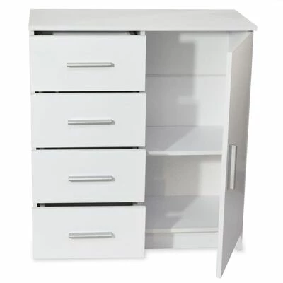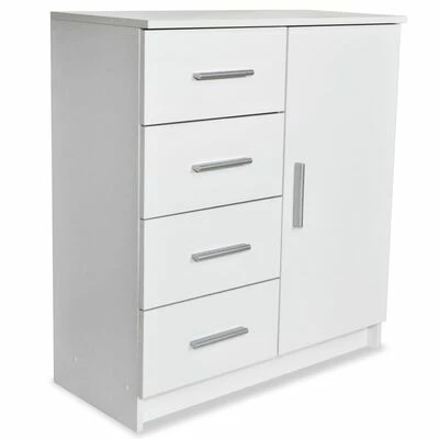 Le buffet est fait d’aggloméré. Il se compose de 4 tiroirs et d’1 grand compartiment pour fournir un grand espace de rangement pour vos différents articles, ce qui rend votre chambre bien rangée et propre. Les accessoires de montage mural et l’ancrage mural pour empêcher le buffet de basculer sont inclus dans la livraison. Cette armoire de rangement durable est facile à nettoyer. L’assemblage est facile.