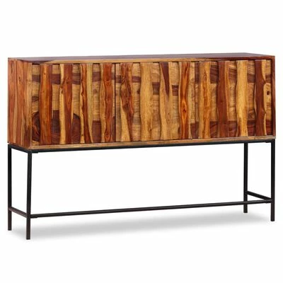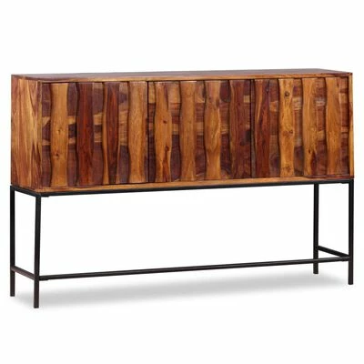 Ce buffet est fait de bois massif de Sesham. Le Sesham, également connu sous le nom de palissandre ou bois de rose, est un bois dur tropical connu pour son grain riche. Ce buffet a un dessus robuste, sur lequel vous pouvez placer des articles décoratifs comme des paniers de fruits ou des vases, pendant que ses jambes fortes en fer forgé contribuent à la construction vigoureuse. Ses armoires offrent amplement d’espace pour garder toutes sortes de petits objets organisés et à portée de main. Il est entièrement fait à la main et les beaux grains de bois rendent chaque meuble unique et légèrement différent l’un de l’autre.