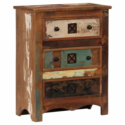 Cette armoire à tiroirs de style antique est faite de bois solide de récupération provenant des solives, des planchers et des poutres de soutènement d’anciens bâtiments démolis et comprend différents types de bois tels que pin, teck, hêtre, cèdre, manguier, acacia, etc. Cela signifie que le bois de récupération conserve les caractéristiques de ces différents types de bois. Le bois de récupération est déjà vieilli, corrodé et séché, donc il ne rétrécit et ne se plie pas. En conséquence, cette armoire latérale rétro est considérablement stable, durable et attrayante. Le savoir-faire et les grains de bois raffinés permettent à chaque meuble de se distinguer et d’être légèrement différent l’un de l’autre. De plus, cette commode comprend 3 tiroirs, offrant un espace ample pour ranger vos vêtements, vos livres et divers autres objets.