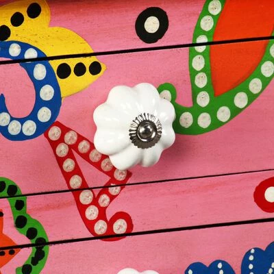 La table est faite à la main en bois de manguier qui est à la fois durable et beau et l’artisanat s’ajoute à son spectaculaire style rétro. La table présente de riches détails décoratifs peints à la main qui exhalent une touche d’élégance et soulignent l’aspect raffiné. Les boutons distinctifs facilitent l’ouverture des tiroirs et rehaussent le style de la table.