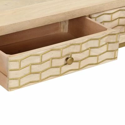 La table est faite en bois de manguier massif et d’acier robuste, et est extrêmement durable. Le bois de manguier est un bois dur résistant et dense qui présente des belles stries et des courbes brunes ou dorées sur la surface. Le dessus robuste est idéal pour placer des objets décoratifs tels que des vases ou des plantes en pot. Les tiroirs offrent amplement assez d’espace de rangement pour garder divers objets bien rangés. Le cadre en acier confère à la table une touche de style industriel. Chaque étape du processus de fabrication est réalisée avec le plus grand soin, que ce soit le polissage, la peinture ou le laquage. La table console est facile à assembler.